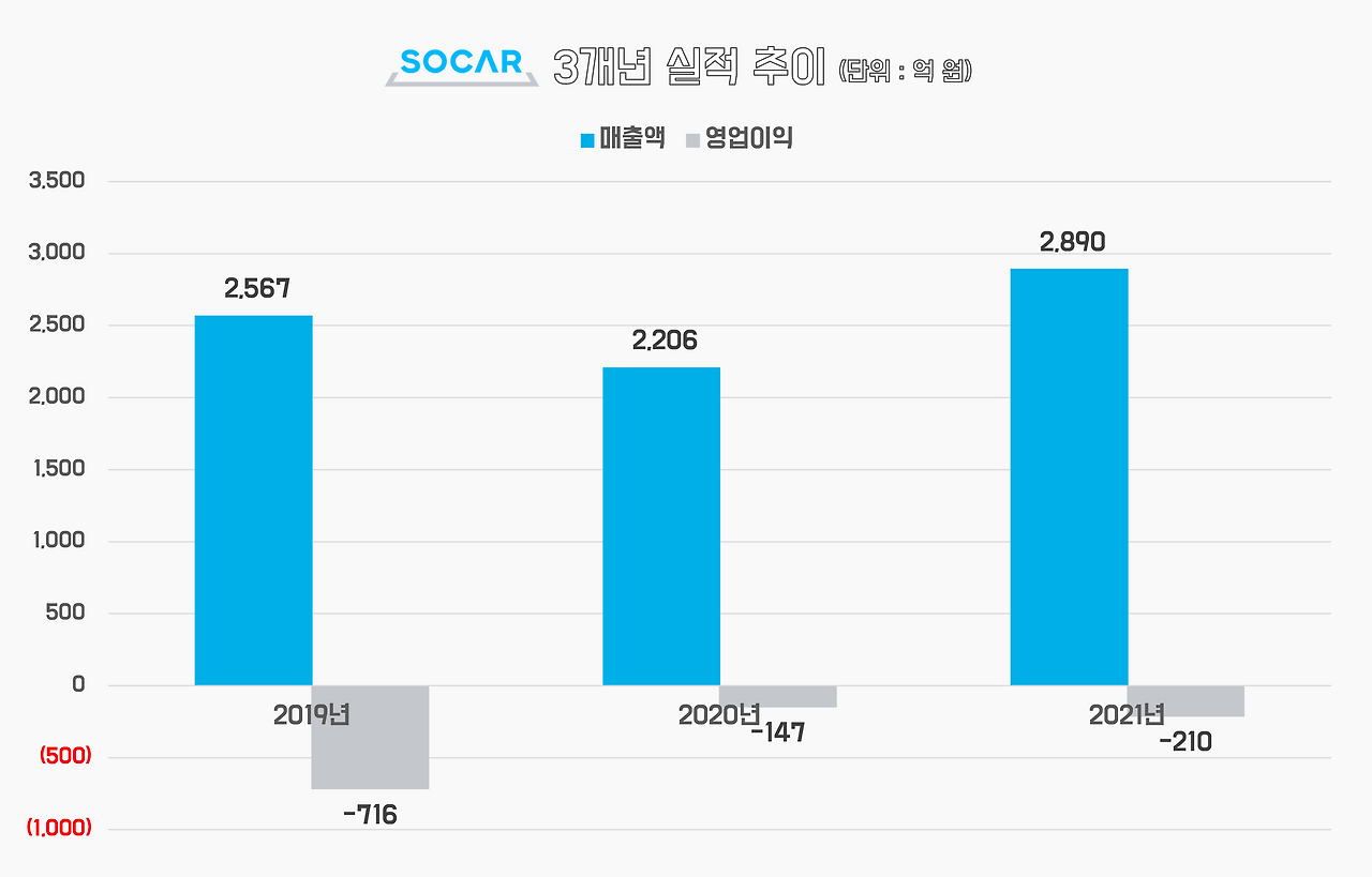다만 증권신고서를 통해 드러난 쏘카의 민낯은 생각보다 더 좋아 보이진 않았습니다. 사실 쏘카의 외형 실적 자체는 그리 나쁘지 않습니다. 코로나 영향으로 2019년 매출이 역성장 하긴 했지만요. 꾸준히 성장 중이기도 하고요. 적자 역시 2019년 대비해서는 지속적으로 줄여나가고 있습니다.