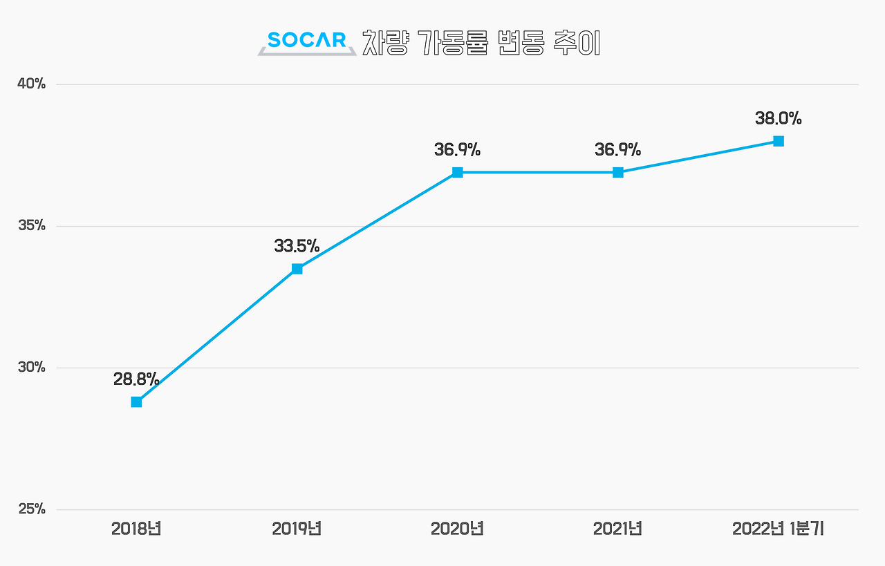 2020년 이후 차량 가동률은 여전히 상승 추세이나 상승폭 자체는 줄어든 상황입니다 (데이터 출처: 쏘카)