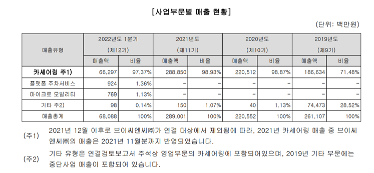 쏘카의 사업 부문 중 카셰어링의 비중은 압도적입니다 (출처: 쏘카 증권신고서)