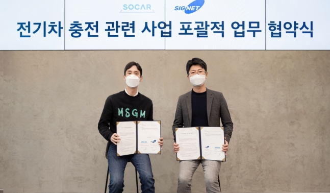 쏘카는 전국의 쏘카존·쏘카스테이션에 시그넷이브이의 충전기를 설치하고, 양사의 차량과 충전기에서 나오는 전기차 충전·결제 데이터를 활용해 미래 신사업 모델을 구축하는 포괄적 업무협약(MOU)을 체결했다고 21일 밝혔다.