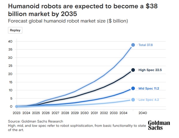 올해 2월 골드만삭스는 오는 2035년까지 세계 휴머노이드 로봇 시장이 약 378억달러(약 52조7000억원)에 이를 것으로 전망했다. (자료=골드만 삭스)