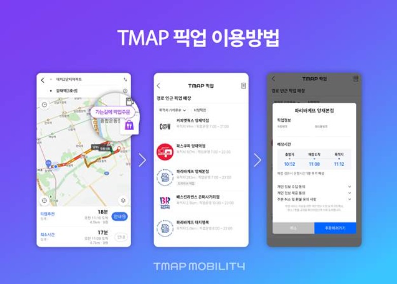 티맵모빌리티가 차량 출발 전 TMAP 내비게이션으로 물품을 주문·결제하고 가는 길에 찾아가는 ‘TMAP 픽업’ 서비스를 출시했다고 6일 밝혔다.