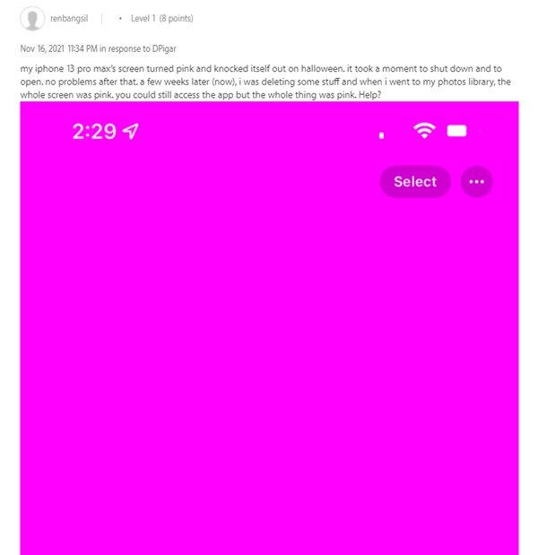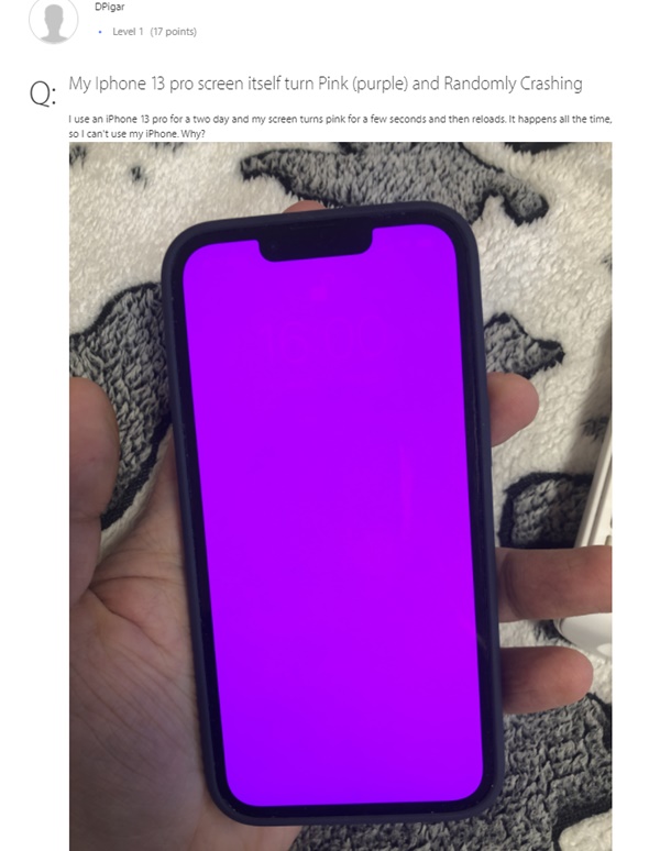 애플 커뮤니티 포럼에 지난해 10월 26일 ‘디파이거(DPigar)’라는 이름의 사용자가 “아이폰 13 프로를 이틀간 사용하다 단말기 화면이 몇 초간 핑크빛으로 변한 뒤 다시 로딩된다. 하루종일 그런다. 그래서 아이폰을 사용할 수 없다. 왜그럴까?”라는 글을 올렸다.