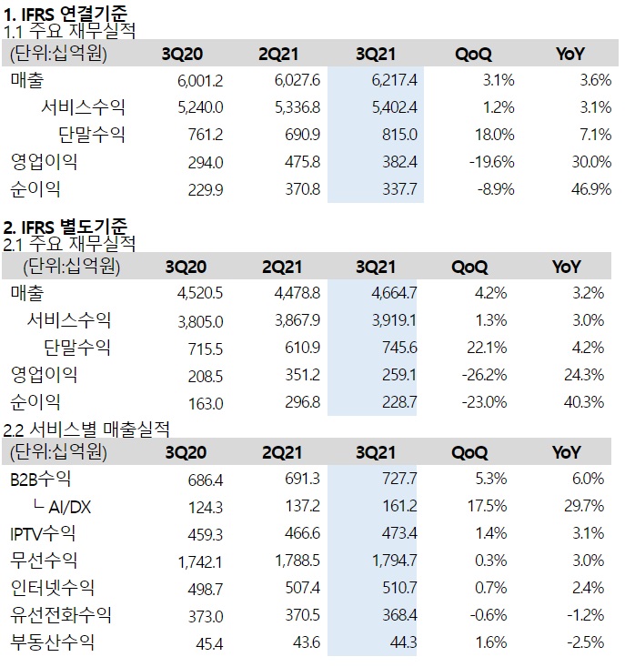 KT가 한국채택국제회계기준(K-IFRS) 2021년 3분기 연결기준 매출 6조 2174억원, 영업이익 3824억원을 기록했다고 9일 밝혔다. 전년 동기 대비 매출은 2162억원(3.6%), 영업이익은 884억원(30.0%) 증가했다.