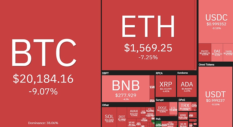 이더리움(ETH)은 전일 대비 7.25% 폭락해 1569달러로 내려앉았다. 바이낸스코인(BNB) 역시 4.3% 하락한 277달러, 솔라나(SOL)는 10% 이상 폭랍한 33.10달러, 리플(XRP)은 6.41% 하락한 0.33달러, 에이다(ADA)도 6.23% 이상 추락한 0.46달러에 거래됐다.