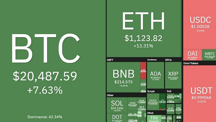 주요 알트코인도 오름세를 보였다. 이더리움(ETH)은 전일 대비 13.31%나 폭등해 1123달러로 올라섰다. 바이낸스코인(BNB) 역시 8.81% 급등한 214달러, 솔라나(SOL)는 8.22% 오른 34.13달러, 리플(XRP)은 5.67% 급등한 0.32달러, 에이다(ADA)도 5% 이상 올라 0.48달러에 거래됐다. 다만 주말 동안 큰 낙폭을 기록한 탓에 투자자 입장에선 회복세가 더디게 느껴지기도 한다.