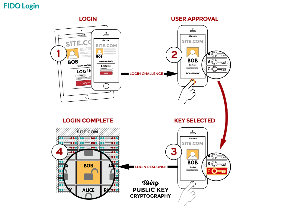 로그인을 하기 위해서는 개인 키와의 대조가 필요한데, 이 개인 키가 바로 지문이나 얼굴 인식 그 자체다. 이러한 개인 키는 서버가 아닌 각자의 스마트폰에 저장이 된다. 즉 개인 키가 없으면 공개 키는 영원히 무슨 뜻인지를 알 수 없는 상황이 되는 것이다.