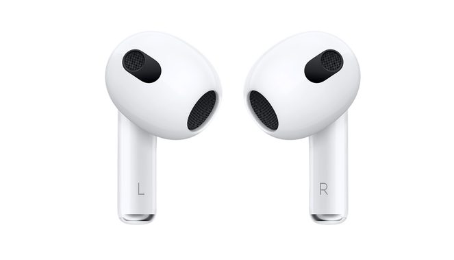 '에어팟3'도 공개됐다. 애플은 기존이 에어팟 프로의 바디에 실리콘을 제거한 디자인으로 '에어팟3'를 출시했다. 노이즈 캔슬링 기능은 없지만, 전작보다 콤팩트해진 게 특징이다.
