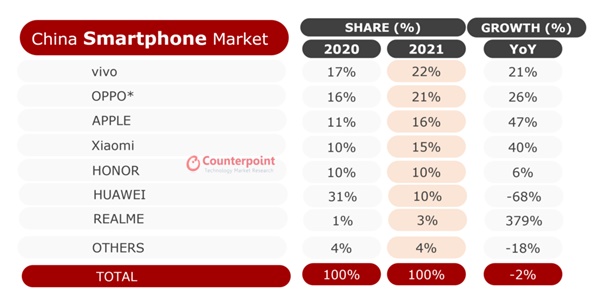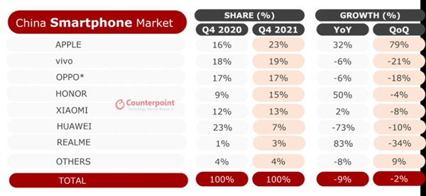예상대로 2021년 마지막 분기의 패배자는 화웨이였다. 화웨이는 중국 시장점유율은 지난해 동기의 23%에서 올해 7%로 급락하며 6위로 밀려났다.