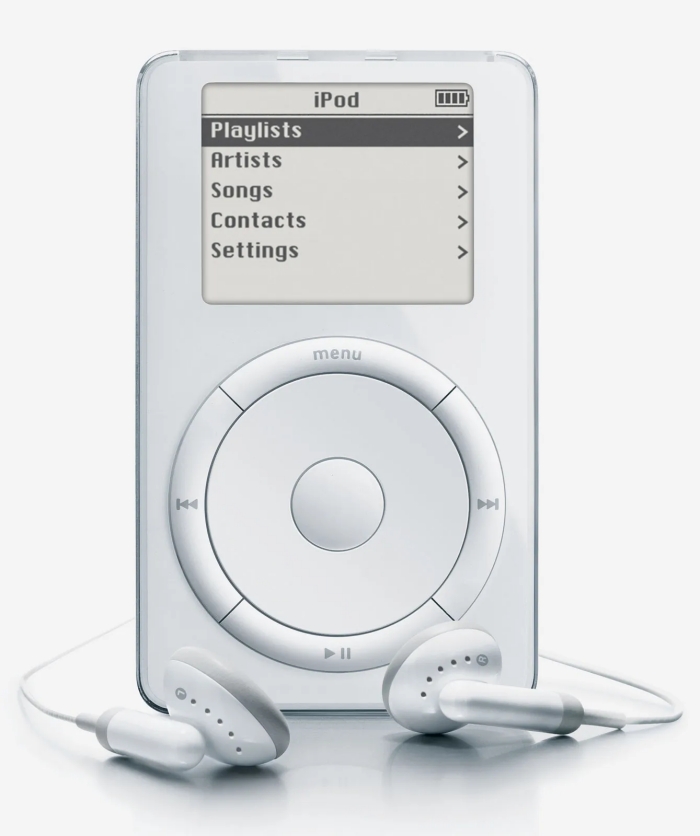 애플의 하얀색 휴대용 음악 플레이어는 작은 하드 드라이브, 아이튠즈와의 긴밀한 연동, 그리고 방대한 음악 라이브러리를 손쉽게 탐색할 수 있는 간편한 스크롤 휠 인터페이스 덕분에 ‘주머니 속에 1000곡’이라는 전례 없는 음악 경험을 선사했다.