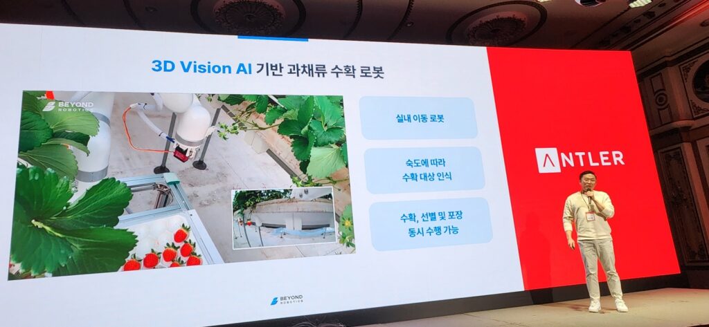 한편 이날 함께 무대에 선 ‘비욘드로보틱스’는 실제 3D 비전 인공지능(Vision AI) 기반 작물 수확 로봇을 제조하는 기술로 승부수를 띄우고 있다. 현재 자체 개발한 과채류 수확 로봇으로 2곳의 농가와 기술 검증(PoC)을 진행하고 있다.
