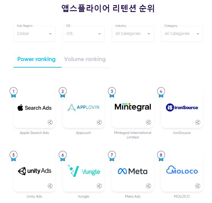 이러한 흐름은 게임 시장에서도 확인할 수 있었다. 안드로이드 게임의 경우 리텐션 부문에서는 구글 애즈가 독보적인 스케일을 기반으로 글로벌 파워 랭킹과 볼륨 랭킹에서 1위를 차지했지만, 2022년 상반기 앱 설치 시장에서 점유율이 2021년 하반기에 비해 감소했다. 메타 애즈는 글로벌 파워 랭킹과 볼륨 랭킹 모두 순위가 한 단계씩 내려갔으며, 앱 설치 점유율 역시 감소한 것으로 나타났다.
