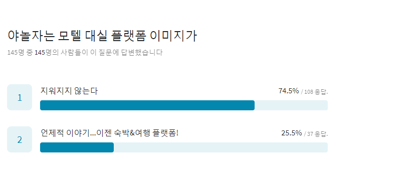 하지만 아무리 장사가 잘 돼도, 야놀자의 고민은 깊어져 갔습니다. 초특가라는 이미지로, 숙박앱 하면 가장 먼저 떠오르게 하는 데는 성공했지만요. 브랜드의 이미지는 여전히 모텔 대실 플랫폼에 머물러 있었기 때문입니다. 조선일보에서 스타트업 뉴스레터 구독자 145명을 대상으로 한 설문조사는 냉혹한 현실을 잘 보여주고 있는데요. 야놀자를 정말 초특가라고 인지한 비율은 고작 21.4%에 불과했습니다. 심지어 모텔 대실 플랫폼이란 이미지가 지워지지 않는다고 대답한 비율도 무려 74.5%에 달했습니다.