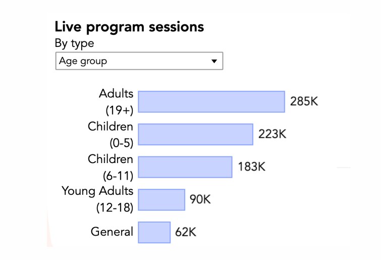 첫 번째 시각화는 공공도서관에서 운영하는 프로그램 참가 횟수를 연령대별로 나타낸 막대 차트입니다. 사례에서는 19세 이상(성인), 0~5세(유아), 6~11세(어린이), 12~18세(청소년)로 참가자의 나이를 세분화했어요. 막대의 길이를 통해 항목 중 성인의 참가 횟수가 28.5만 명으로 가장 많다는 것을 알 수 있습니다. 얼핏 보면 성인이 가장 많이 참여한 것 같지만, 19세 이하 미성년자 전체를 의미하는 나머지 3개 막대의 수치를 더해보면 총 49.6만 명으로, 성인의 약 1.7배가 되는 인원이 도서관 프로그램에 참가했다는 것을 알 수 있습니다. 나머지 막대를 서로 비교해 보면, 유아, 어린이, 청소년 순서대로 프로그램 참가 횟수가 많다는 사실을 알 수 있는데요. 이를 통해 공공도서관이 지역사회의 교육과 양육 등의 역할을 분담하여 수행하고 있다고 짐작해 볼 수 있습니다.