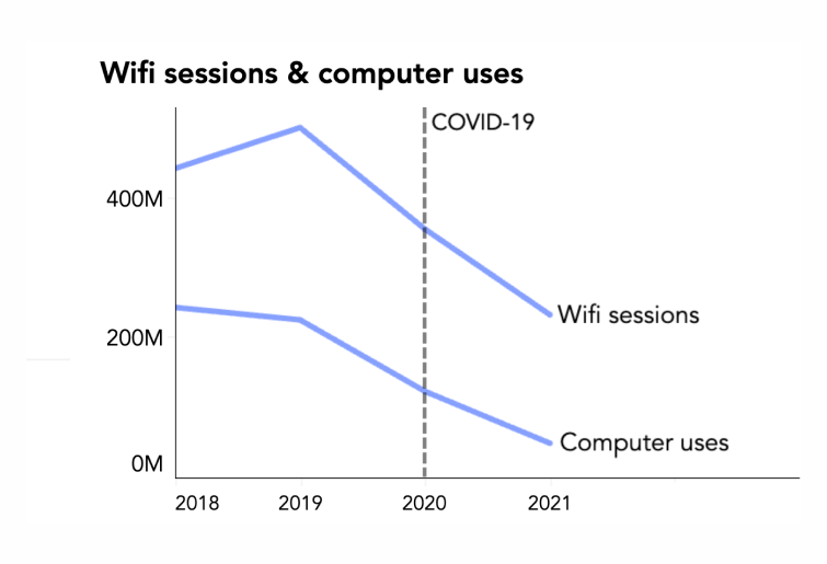 다음 사례는 공공도서관에서 제공하는 와이파이의 접속 수(Wifi sessions)와 컴퓨터 이용 수(Computer uses)를 시각화한 라인 차트입니다. x축은 연도를, y축은 접속 및 이용 횟수를 나타냅니다. 상단의 와이파이 접속 수 라인을 먼저 살펴보면, 2018년에서 2019년까지는 접속 수가 상승하다가 2019년을 기점으로 급격하게 하락하는데요. 하단의 컴퓨터 이용 수 라인 역시 2018년에 가장 높은 데이터 값을 기록한 뒤 꾸준히 하락하고 있습니다. 와이파이와 컴퓨터라는 두 항목의 라인 차트가 비슷한 궤적을 그리고 있다는 것이 인상적인데요! 코로나19 당시, 공공도서관을 찾는 시민의 수 자체가 줄어들며 와이파이 접속 수와 컴퓨터 이용 수가 모두 급격하게 줄어든 것이죠. 이를 통해 코로나19라는 외부적 요인 때문에 디지털 접근성에 어려움이 있었을 것임을 예상할 수 있었습니다. 이러한 상황에서도 시민들의 접근성이 끊어지지 않도록, 도서관에서는 다양한 정보 서비스를 개발해야겠네요!
