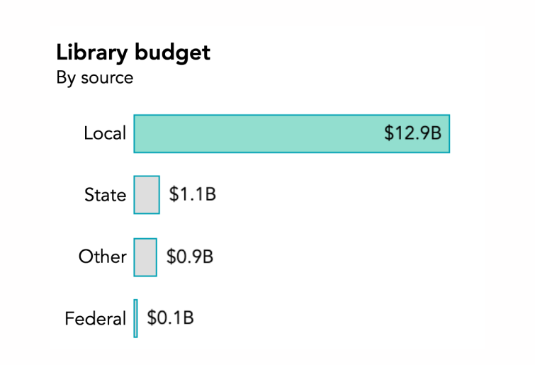 위 차트는 미국의 공공도서관 운영에 투입되는 예산을 출처별로 나타낸 막대 차트입니다. 차트 위에서부터 순서대로 지방정부(Local), 주정부(State), 기타(Other), 연방정부(Federal)를 의미해요. 가장 긴 막대를 의미하는 지방 정부의 투입 예산은 약 129억 달러로, 다른 항목들의 10배가 넘는 금액인데요. 막대의 크기가 큰 순서대로 항목을 정렬함으로써, 가장 상단에 있는 지방 정부 예산이 공공 도서관 운영에 투입되는 예산에서 차지하는 비중이 매우 크다는 사실을 직관적으로 파악할 수 있습니다.
