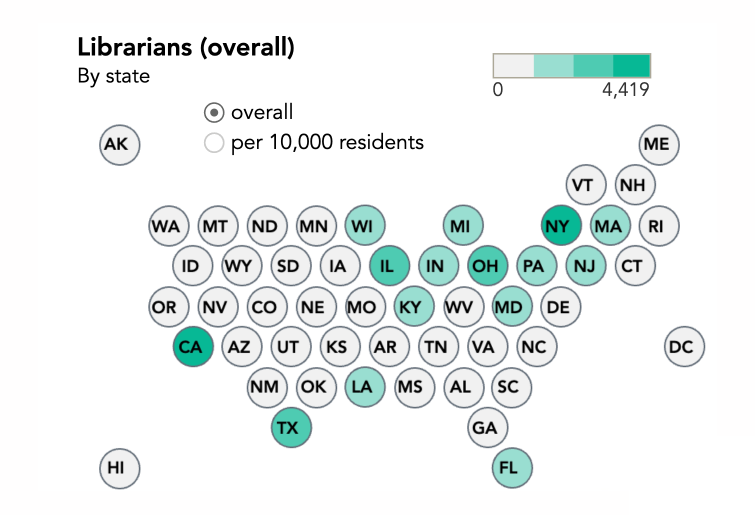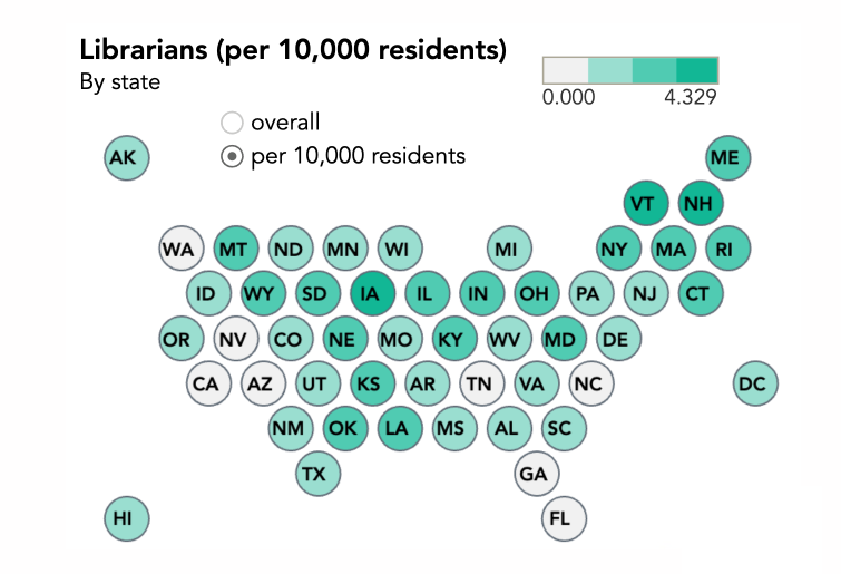 하지만 전체 사서 수만으로는 공공도서관의 운영 현황을 정확하게 파악하기 어려운데요. 해당 지역의 도서관 개수나 전체 인구수를 함께 고려해야 도서관 운영에 충분한 인력이 배치되어 있는지를 확인할 수 있기 때문입니다. 실질적인 도서관 인력 현황을 나타내기 위해, 위 차트에서는 주민 만 명 대비 사서의 수를 타일 색상으로 표현했습니다. 색상 범례에 따르면, 옅은 회색의 타일은 주민 만 명당 사서 수가 1명 이하인 경우를 나타냅니다. 네바다(NV), 애리조나(AZ), 테네시(TN) 등이 해당하는데요. 지역 간의 인력 불균형을 막기 위해, 이와 같이 사서 수가 적은 특정 지역의 인력 충원을 위한 노력이 필요해 보입니다!