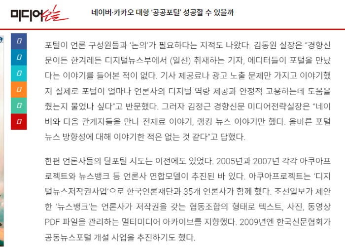 7월 11일 진행된 언론진흥재단의 '디지털 뉴스 유통구조 개선 방안' 세미나에서는 언론사 공동의 뉴스 포털 모델을 이야기했다. 공동으로 구축한 뉴스 포털에 기사를 제공하되 뉴스 제공 방식이나 기사 큐레이션과 올바른 배열 방안 그리고 언론사와 이용자 참여에 대한 그간의 연구 결과를 내놓았다. '다양성과 지역성 확보 그리고 투명한 저널리즘의 질적 제고 등을 근거로 하는 (언론사) 공동의 뉴스 포털 도입이 절실'하다는 것이 이유였다. 당연하지만 언론사 협업이 필요하고 포털이 아닌 언론사들이 주체가 되는 것이며 이를 통해 뉴스 배열과 유통은 물론이고 상업성 짙은 포털 기업의 사회적 책임을 촉구하고 강화할 수 있을 것이라고 덧붙였다.