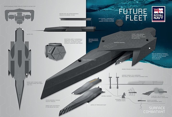 마지막으로 수면을 미끄러져 가는 ‘외양 전투선(Surface Combatant)’이 있다. 영국 해군 요원들은 이 선체 밑에 붙은 소형 모듈형 소형 ‘거주가능 팟’(소형 수중 드론)을 타고 수면 전투선을 드나들게 될 것이다.