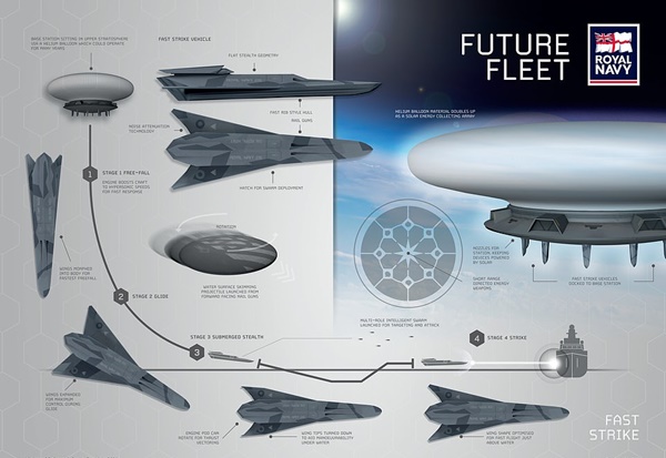 영국 해군이 최근 소개한 ▲지구 대기권 위 성층권에 기반을 둔 드론 기지인 ‘패스트 스트라이크(Fast Strike)’ ▲미래형 잠수함인 ‘수중 플랫폼(Underwater Platform)’ ▲‘운반 선박(Carrier Vessel)’ ▲외양 전투선(Surface Combatant)’을 차례로 살펴 봤다.
