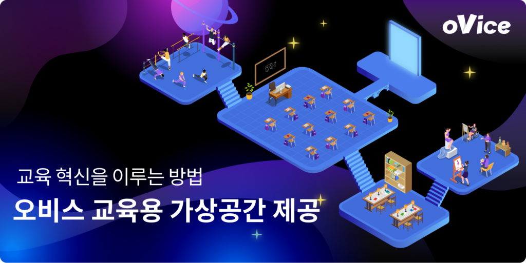강의용 가상공간은 통합된 온라인 교육 환경을 제공하며, 아바타를 이용하여 학생과 교사 모두 한 공간에 참석하여 토론이 가능하다. 이는 실재감과 동시성을 주는 오비스 메타버스의 특징이다.
