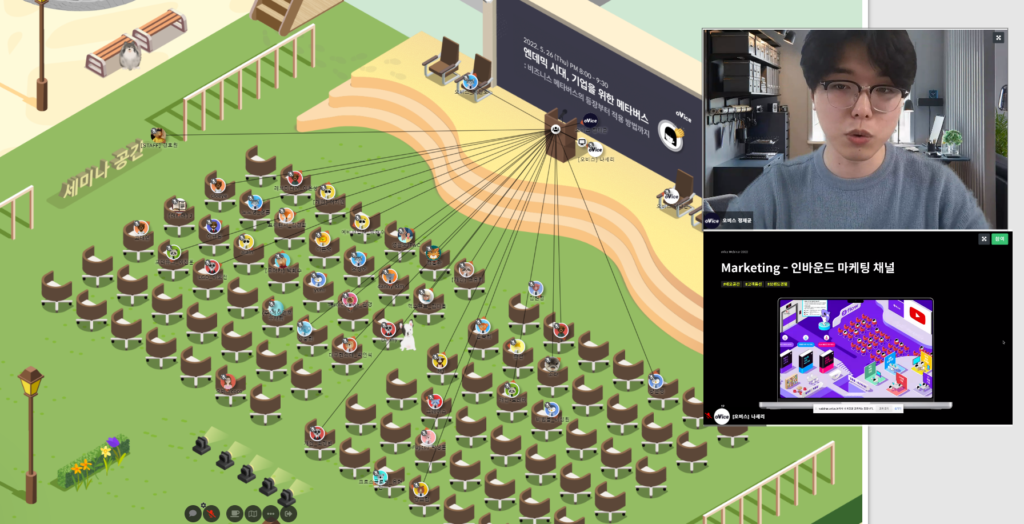 오비스 웨비나 가상공간에서 첫 번째로 진행된 이번 웨비나에는 메타버스 활용법에 관심있는 기업 디지털 혁신팀, 인사팀, 마케팅팀 등 직장인 130여 명이 참가했다.