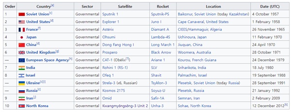 우주클럽 국가로는 러시아(1957), 미국(1958), 프랑스(1965), 일본(1970), 중국(1970), 영국(1971), 인도(1980), 이스라엘(1988), 이란(2005), 북한(2012·저궤도에 위성을 올렸으나 신호는 잡히지 않음)이 꼽힌다.