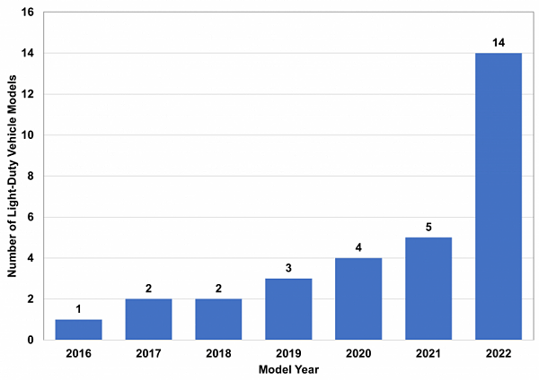 2016년 첫 조사 당시 최대주행거리 480km 수준의 차량은 단 1종에 그쳤다. 이후 2017년에 2종으로 늘더니 2019년에는 3종, 2020년에는 4종, 2021년에는 5종, 그리고 올해인 2022년에는 갑자기 14종으로 늘었다.