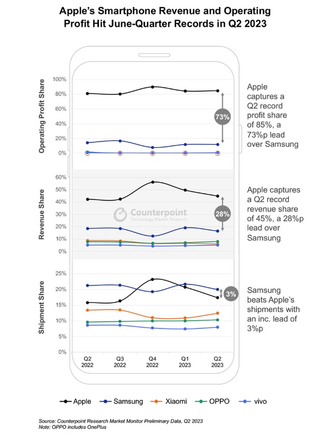 조금 더 자세히 보자면, 지난 2분기 전세계 스마트폰 출하량이 중 삼성전자가 22%를 가져가면서 애플을 제치고 1위에 올랐지만, 영업이익은 전체의 85%에 해당하는 110억 달러를 애플이 가져가고, 삼성이 12%를 가져갔다고 합니다. 덜팔고 훨씬 많이 벌어들인 것이죠.