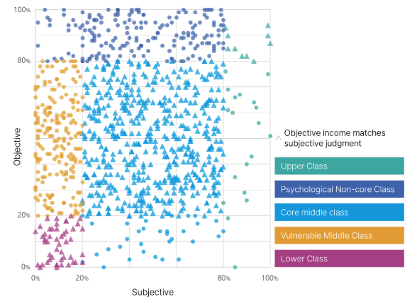 중산층이 이렇게 세 가지로 나뉜 이유는 무엇일까요? 이들은 모두 소득에 의해 중산층으로 분류되지만, 계층 인식 조사를 통해 자신을 다르게 정의하기 때문입니다. 예를 들어 차트 왼쪽의 노란색 원을 한 번 볼까요? 이 색상은 ‘취약 중산층(Vulnerable Middle Class)’으로 소득 수준은 중간층이지만 자신을 하층으로 간주하는 집단입니다. 이들의 Y축을 살펴보면 20%에서 80% 사이로 중산층에 속해 있지만, X축은 0%에서 20% 사이인 하층에 머물러 있습니다. 차트에서는 이처럼 자신이 속한 계층과 스스로 인식하는 계층에 차이가 있는 경우를 원형으로 표현했습니다.
