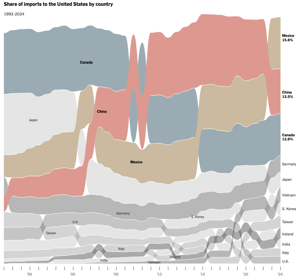 뉴욕 타임스의 ‘미국이 중국, 캐나다, 멕시코에서 수입하는 금액은 다음과 같습니다(This is How Much the U.S. Imports From China, Canada and Mexico)’에 수록된 시각화로 자세한 내용을 파악할 수 있었는데요! 위 그림은 각 나라의 수입액 비중을 순위별로 나타낸 리본 차트입니다. X축은 1992년부터 2024년까지의 연도, Y축은 각 교역국으로 해당 연도의 비중별 순위를 나타냈습니다. 이 중 관세 부과가 선언된 멕시코, 캐나다, 중국을 각각 갈색, 청록색, 빨간색으로 칠했습니다. 수입액 비중을 클수록 Y축의 상단에 배치되어 연도별로 미국에 가장 많은 제품을 수입한 나라를 살펴볼 수 있는데요! 리본 차트를 통해 흐름에 따른 비중 변화와 순위 변화를 볼 수 있습니다.