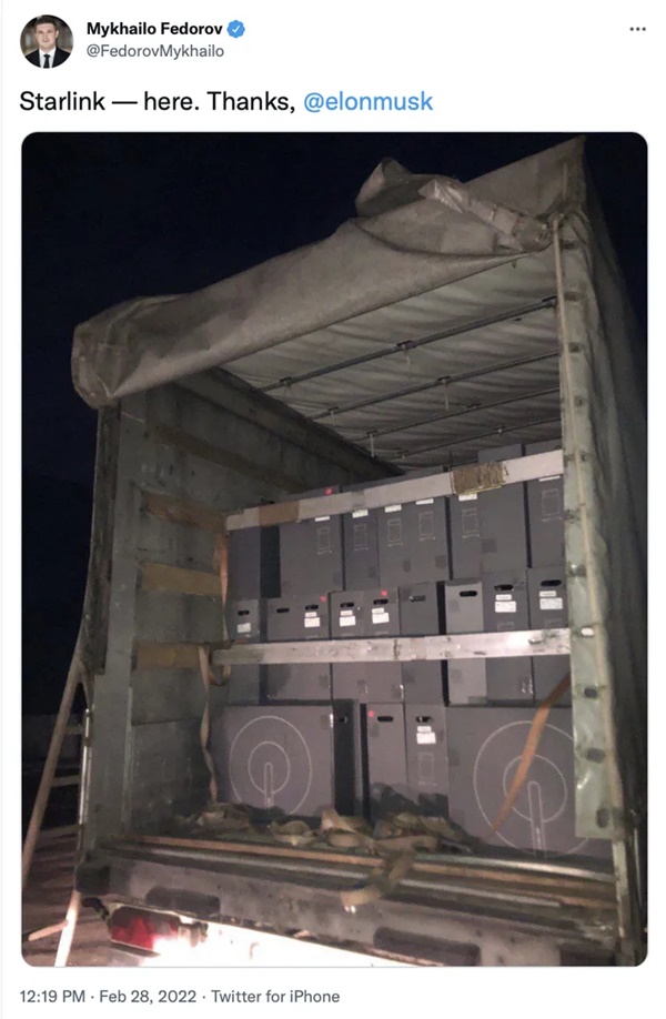 미하일로 페도로프 부총리는 일론머스크 스페이스X 최고경영자(CEO)에게 우크라이나에 스타링크 인터넷 위성 수신기(접시 안테나형 개인 기지국)를 보내달라고 요청했다.