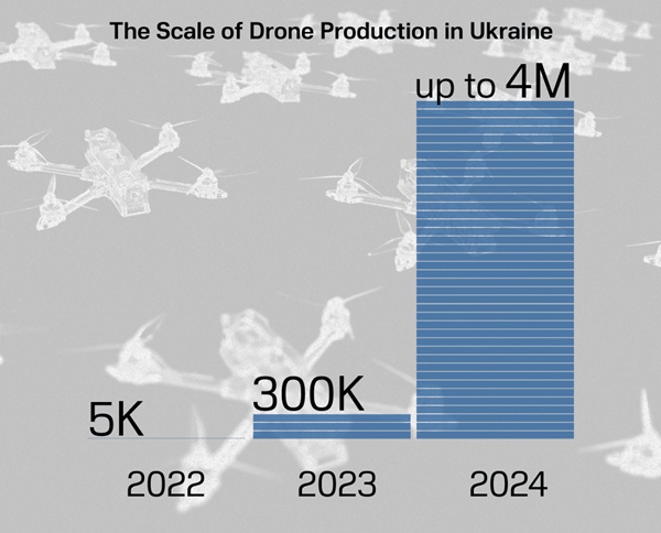 우크라이나는 전쟁 초기만 해도 연간 수천대의 미미한 드론 기술 및 생산국이었지만 이제는 연간 수백만대를 생산하며, AI 기술과 결합해 GPS 교란을 피하는 사용되는 호환형 모듈과 SW 기술까지 갖추기에 이르렀다. 그러면서 미국, 중국, 이스라엘, 투르키예와 함께 명실상부한 세계 5대 드론 강국(이란과 맞먹는) 반열에 올랐다는 평가까지 받고 있다.