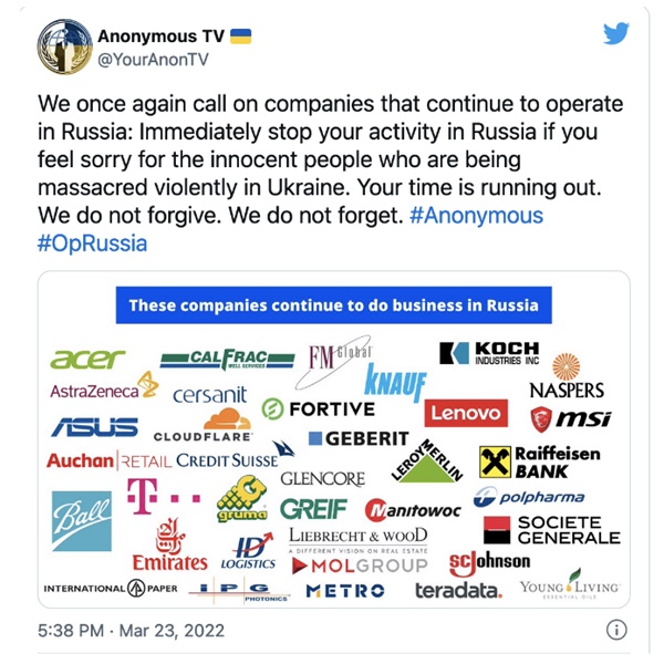 지난 3월 말 어나니머스가 운영하는 것으로 보이는 ‘@YourAnon’이라는 이름의 트위터 계정은 러시아에서 여전히 사업을 하고 있는 것으로 알려진 회사들의 로고를 올리기 시작했는데, 한 게시물은 48시간 안에 러시아에서 철수하라는 최후통첩을 보내면서 “그러지 않으면 당신은 우리의 목표가 될 것이다”라고 말했다.