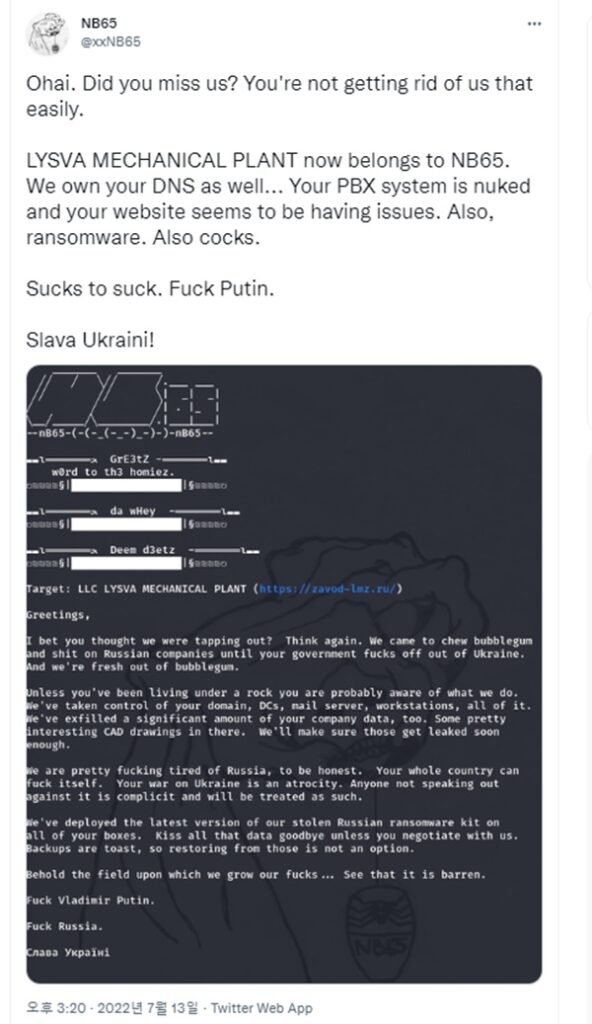 이는 ‘NB65’같은 숙련된 해커들이 더 진보된 공격을 할 수 있게 해 주었다. 어나니머스와 연계된 해킹그룹인 NB65는 지난달 13일 트위터에서 “러시아 전력회사 레닌그라드스키 메탈릭헤스키 자포드가 운영하는 제조 공장의 도메인, 이메일 서버, 워크스테이션을 장악하기 위해 ”러시아 랜섬웨어를 사용했다”(위 사진)고 주장했다.