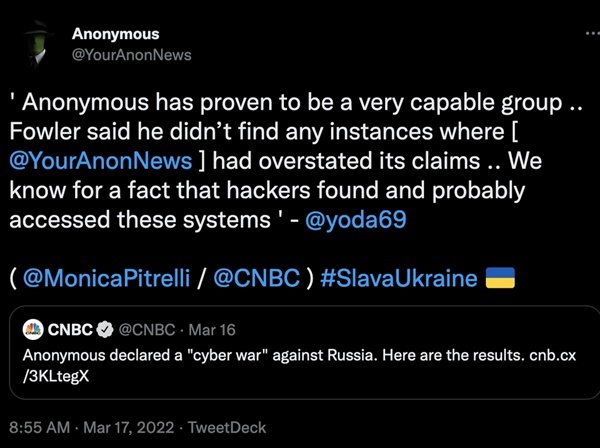 파울러에 따르면 어나니머스는 2,500개가 넘는 러시아와 친 러시아국인 벨라루스(우크라이나 침공 동조 및 협력국)의 사이트를 해킹했다고 주장했다. 그는 “도난 당한 데이터가 온라인으로 유출된 경우도 있는데 데이터 양이 너무 많아 검토하는 데 몇 년이 걸릴 것”이라고 말했다. 그는 “가장 큰 발전은 온라인에서 암호화되거나 버려지는 방대한 양의 기록”이라고 덧붙였다.