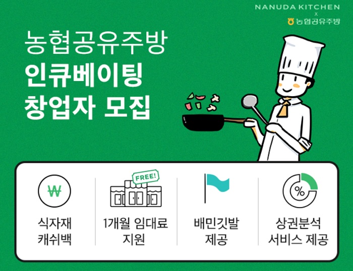 외식업 창업자에게 공유주방 창업에 필요한 서비스를 제공하는 플랫폼 기업 위대한상사와 농협경제지주가 ESG 기반 스마트 공유주방 활성화를 위한 시범 운영 점포인 ‘농협공유주방’의 인큐베이팅 창업자를 모집한다.