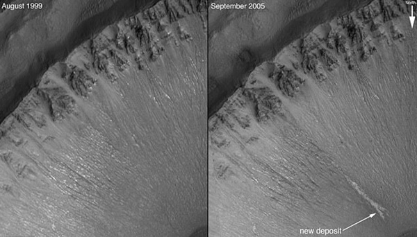 화성에 물이 있다는 첫 증거는 지난 2006년 미항공우주국(NASA·나사)에 의해 발표됐는데 테라 사이렌룸과 센타우리 몬테스라고 불리는 두 개의 분화구의 사진은 1999년과 2001년 사이 어느 시점에 화성에 액체 상태의 물이 존재한다는 것을 보여주는 것으로 보인다.