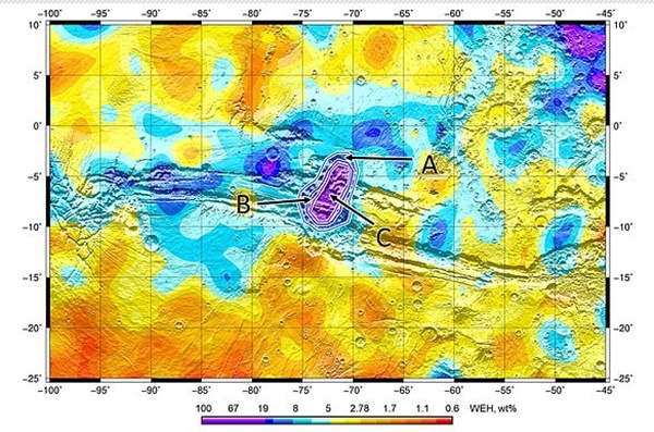 미트로파노프 박사는 “FREND는 거대한 매리너스 협곡 시스템에서 비정상적으로 많은 양의 수소가 있는 지역을 밝혀냈다. 우리가 보는 수소가 물 분자에 결합돼 있다고 가정하면 이 지역에 있는 지표면 근처 물질의 40%가 물로 보인다”고 말했다.과학자들은 지표면 아래에 있는 물이 얼음의 형태인지 아니면 토양에 있는 다른 미네랄과 화학적으로 결합되어 있는지 확신하지 못하고 있다.