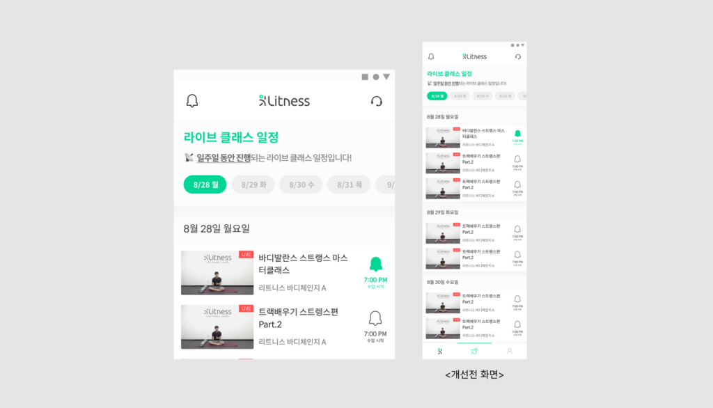 리트니스는 코치와 실시간으로 운동할 수 있는 홈트레이닝 서비스를 2019년도 말부터 제공해왔다. 나는 팀에 합류했을 때부터 실시간 운동(real time)의 허들을 넘기 위해 무던히 노력했다. 아직도 보완하고 손 봐야 할 곳이 많은 프러덕트지만, 그중에서도 서비스 초기의 잔재로 남아 내 마음을 지속적으로 괴롭혀왔던 화면이 하나 있다. 무려 GNB 영역에 떡하니 자리하고 있는 [라이브 일정 탭]의 화면이다.
