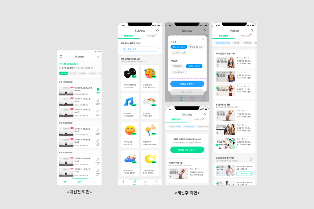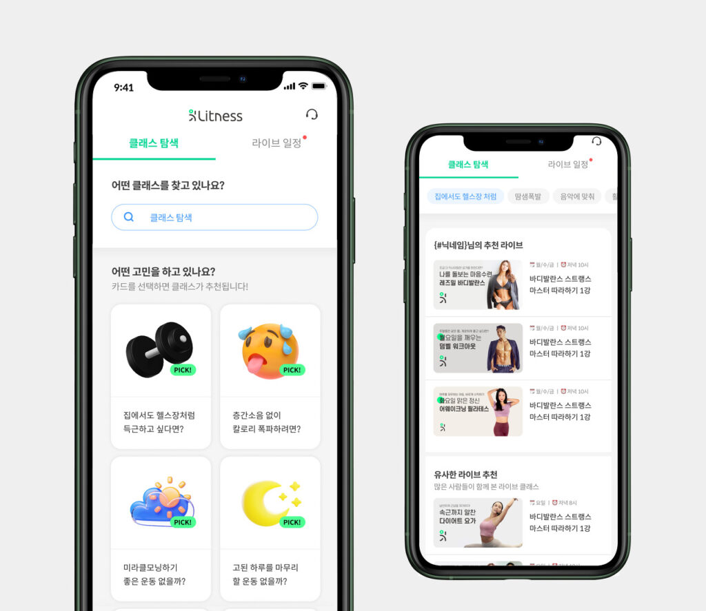 우선, 기존의 [라이브 일정]을 표시하던 타임라인 형태의 화면을 서브 탭으로 분리했다. 그리고 화면을 위아래로 구분하여, 각각 클래스를 탐색할 수 있는 영역과 클래스를 추천 받을 수 있는 영역으로 나눴다. 여기에 유저들이 공감할 수 있는 8가지 키워드를 선별하여 ‘어떤 고민을 하고 있나요?’라고 묻는 질문과 함께 카드 형태로 나열했다.