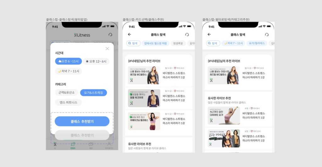 카드를 선택해 클래스를 추천받을 수 있는 영역의 상단에는 필터를 이용해 클래스를 탐색할 수 있는 영역을 마련했다. 유저는 1) 필터를 이용해 클래스를 탐색하거나, 하단에 나열된 2) 카드를 선택해 클래스를 추천 받을 수 있는 것이다. 유저는 시간과 운동 종류(카테고리)를 필터링하여 라이브와 VOD클래스를 탐색할 수 있다.