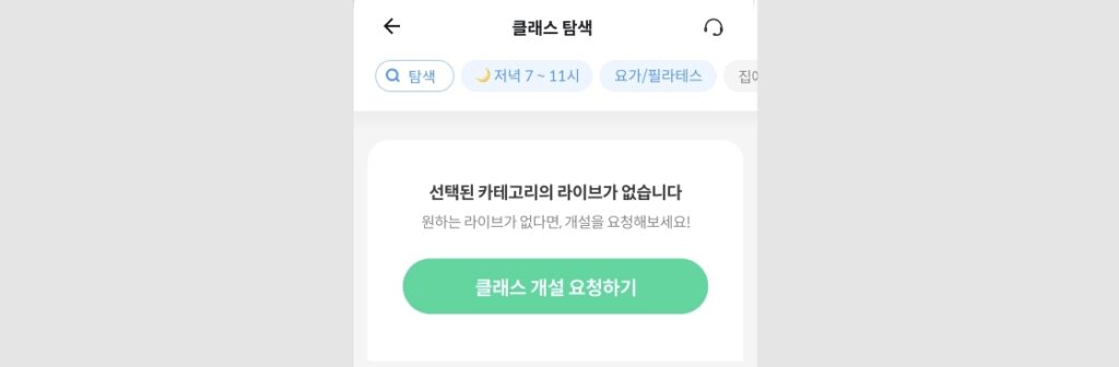 24시간을 라이브 클래스로 커버할 수 없기 때문에, 특정 필터를 걸게 되면 추천 라이브 클래스가 표시되지 않는 케이스가 나타난다. 이때, 단순히 ‘검색 결과가 없다'라고 안내하지 않고 뭐든 경험을 이어나가고 싶었다.