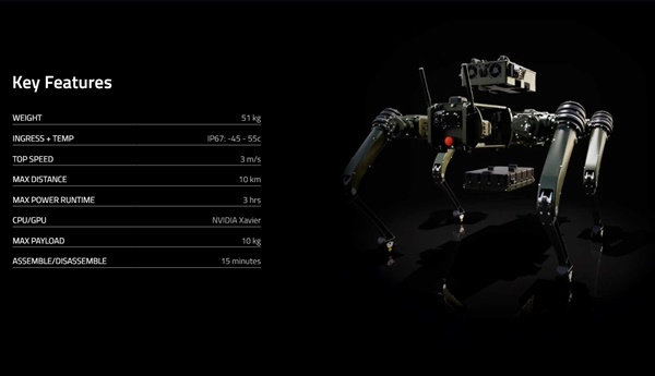 비전 60의 무게는 51kg이다. IP67 수준의 방수 성능도 갖췄다. 1m 깊이 물에서 30분간 견디는 수준이다. 영하 45℃의 혹한과 영상 55℃의 폭염에서도 작동을 보장한다. 최고 이동 속도는 초속 3m다. 최대 10km 범위의 영역을 경비할 수 있다. 최대 작동시간은 3시간이다. 보스턴 다이내믹스의 스팟 작동시간이 최대 90분인 것을 감안하면 그 2배의 작동 시간을 자랑한다. 로봇 구동에 사용되는 칩셋은 엔비디아의 자비에르다. 최고 탑재 용량은 10kg이다. 15분 만에 조립이나 해체가 가능하다.