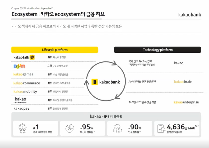 상장 계획을 발표하며 윤 대표가 꼽은 카카오뱅크의 경쟁력 중 하나는 ‘카카오 에코시스템(Ecosystem)’이다. 이는 카카오톡, 인터넷 포털 다음을 비롯해 카카오 게임, 머커스, 모빌리티 엔터네인먼트와 카카오 페이에 이르는 각각의 플랫폼 사업이 카카오뱅크와 연계돼 있음을 의미한다. 즉 카카오뱅크 역시 향후에는 모바일 앱을 기반한 인터넷은행으로서 엄청난 이용자 수를 활용한 금융 플랫폼 사업을 진행할 수 있다는 것이다.
