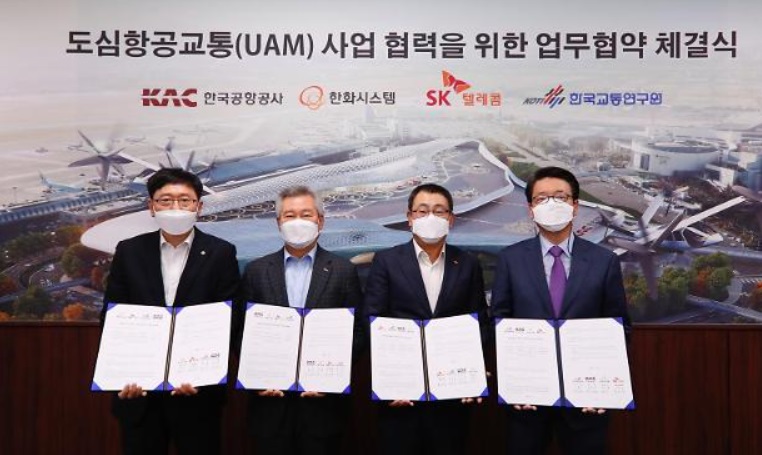 SK텔레콤은 27일 김포공항에서 한국공항공사, 한화시스템, 한국교통연구원과 도심 항공모빌리티(UAM) 사업화를 위한 업무협약을 체결했다고 28일 밝혔다. UAM은 전기 구동 수직 이착륙 소형기체(eVTOL)를 활용한 항공 이동 서비스다. 승용차로 1시간 걸리는 거리에 20여분 만에 도착할 수 있다.