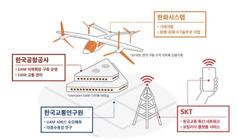 SK텔레콤은 항공교통 통신 네트워크 모델을 실증하고 구축하는 역할을 맡았다. UAM을 안전하게 관제하기 위해서는 기체와 지상을 연결하는 안정적인 통신 체계가 필요하다. SK텔레콤은 지상뿐만 아니라 공중에서도 최적의 통신 환경을 제공할 수 있도록 네트워크를 구축한다.
