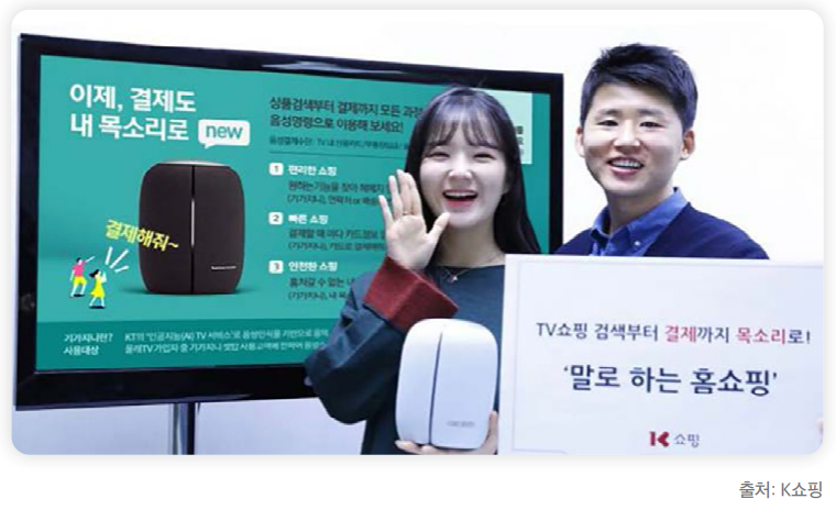 2017년에 도입된 KT의 ‘기가지니’ 서비스는 IPTV에 처음 적용한 이후, 동년 10월 관계사 K쇼핑과의 서비스 제휴를 통해 ‘보이스 커머스’ 서비스를 런칭했다. 해당 ‘보이스 커머스’는 음성으로 상품 검색과 주문을 진행하여 빠르고 편리한 쇼핑이 가능했다. 또한 별도의 인증수단 없이도 사전에 인증된 음성 명령만으로 상품 구매가 가능하며, 고객의 휴대폰으로 주문 URL이 포함된 메시지가 전송되어 결제도 간편하게 지원한다. 2020년 8월 기준 ‘기가지니’ 서비스 가입자는 250만을 달성하였으며, 향후 지속적 서비스 업그레이드를 통한 서비스 확대가 예상(KT블로그, 2019)되고 있어 추후의 시장 고객 반응이 어떨지 그 귀추가 주목된다.