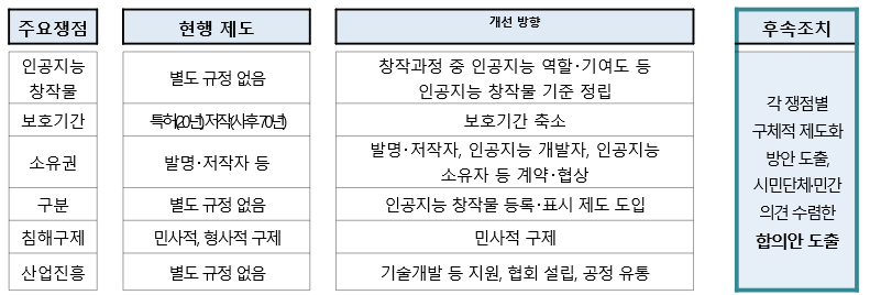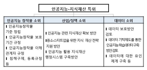 인공지능-창작물 소위에서는 ▲인공지능을 저작자·발명자로 인정할 것인지에 대한 기본원칙 마련 ▲인공지능 창작물의 차별적 보호 및 소유권 주체에 대한 기본원칙 정립 ▲인공지능 창작물에 대한 지식재산 체계 등을 종합적으로 포함하는 '(가칭) 인공지능 지식재산 특별법'제정의 실효성 검토 및 방안을 수립해 나갈 예정이다.
