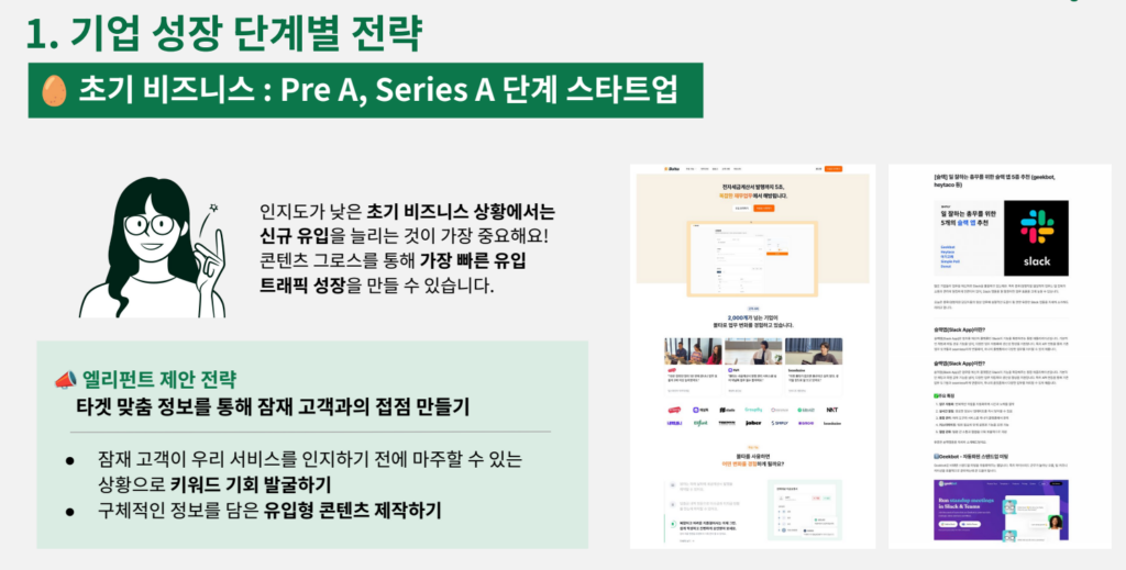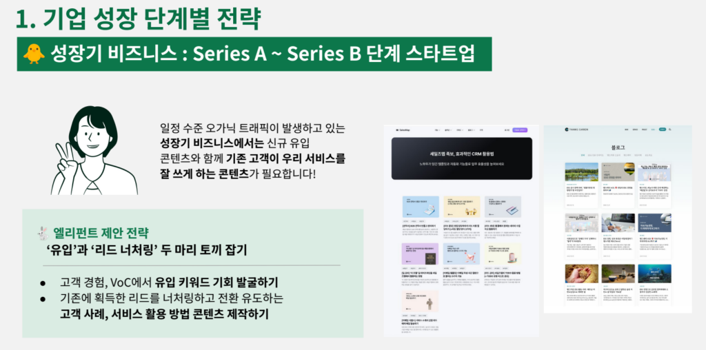 텍스트를 활용한 기업 성장 전략, 즉 콘텐츠 그로스는 2023년 1월, 새롭게 출범한 엘리펀트컴퍼니를 통해 더욱 구체화됐다. 엘리펀트컴퍼니는 단순히 콘텐츠 제작을 하는 회사를 넘어 기업 웹사이트의 콘텐츠를 다시 설계하고, 산업별 고객 사례를 재해석하며, 블로그·리포트 등 텍스트 자산 전체를 하나의 퍼널로 엮어내는 구조적 접근을 한다. 콘텐츠가 어떤 경로에서 고객을 유입시키고 설득하고 전환시키는지를 데이터 단위로 분석해, 다음 전략을 다시 설계하는 다양한 형태의 ‘그로스 엔진’을 구축하는 방식이다.